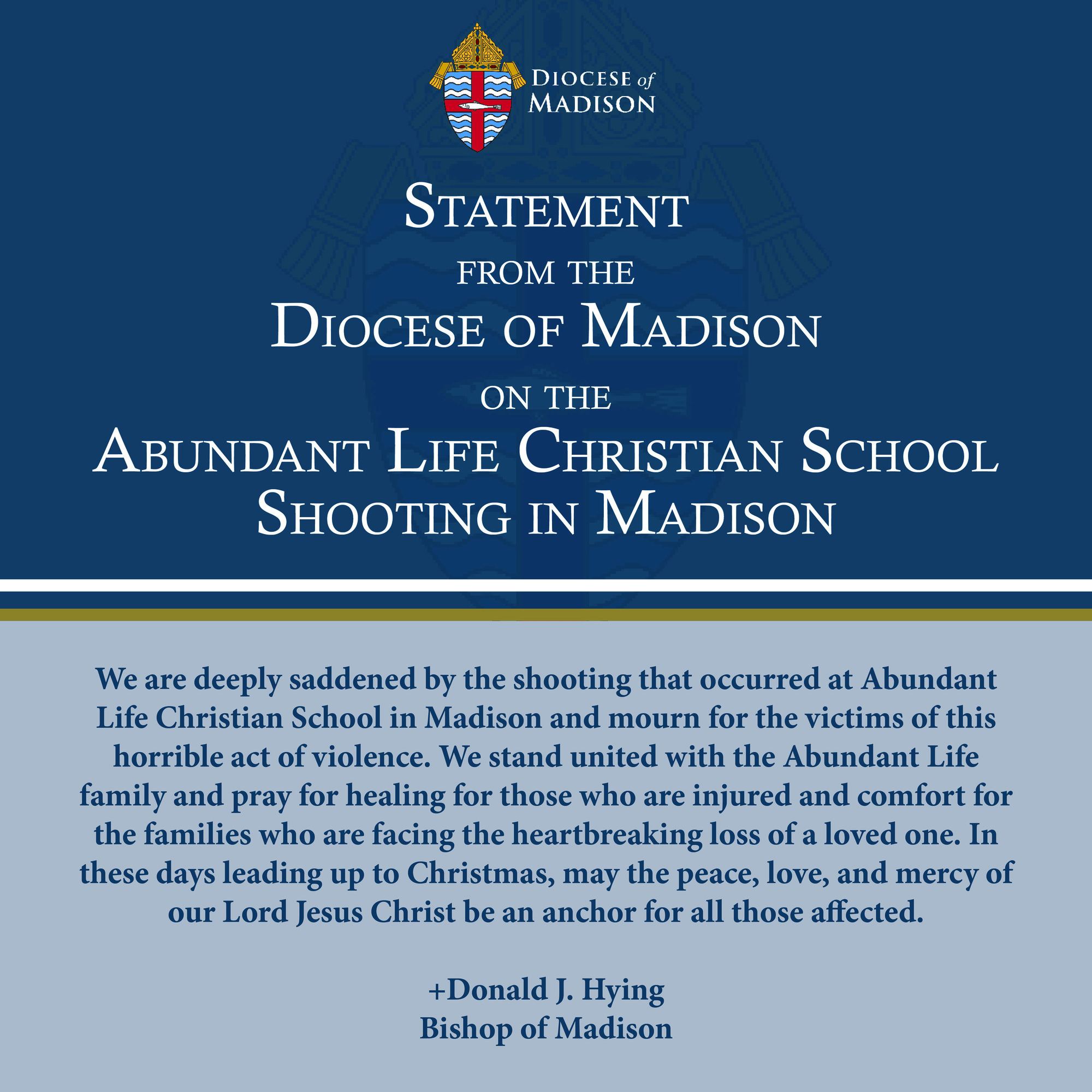 We are deeply saddened by the shooting that occurred at Abundant Life Christian School in Madison and mourn for the victims of this horrible act of violence. We stand united with the Abundant Life family and pray for healing for those who are injured and comfort for the families who are facing the heartbreaking loss of a loved one. In these days leading up to Christmas, may the peace, love, and mercy of our Lord Jesus Christ be an anchor for all those affected.